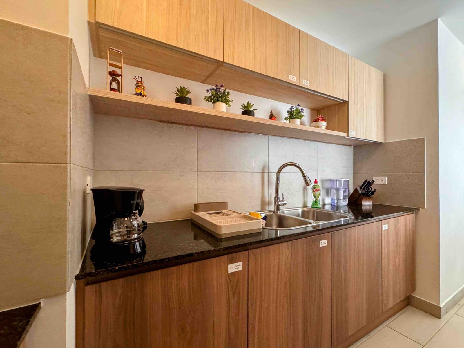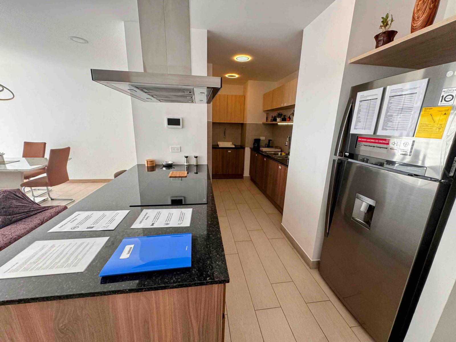 • COCINA ESTILO AMERICANO, CON PLANCHA DE COCINA DE INDUCCIÓN, TIPO ISLA, EXTRACTOR DE OLORES, REFRIGERADORA, MICROONDAS Y DESAYUNADOR