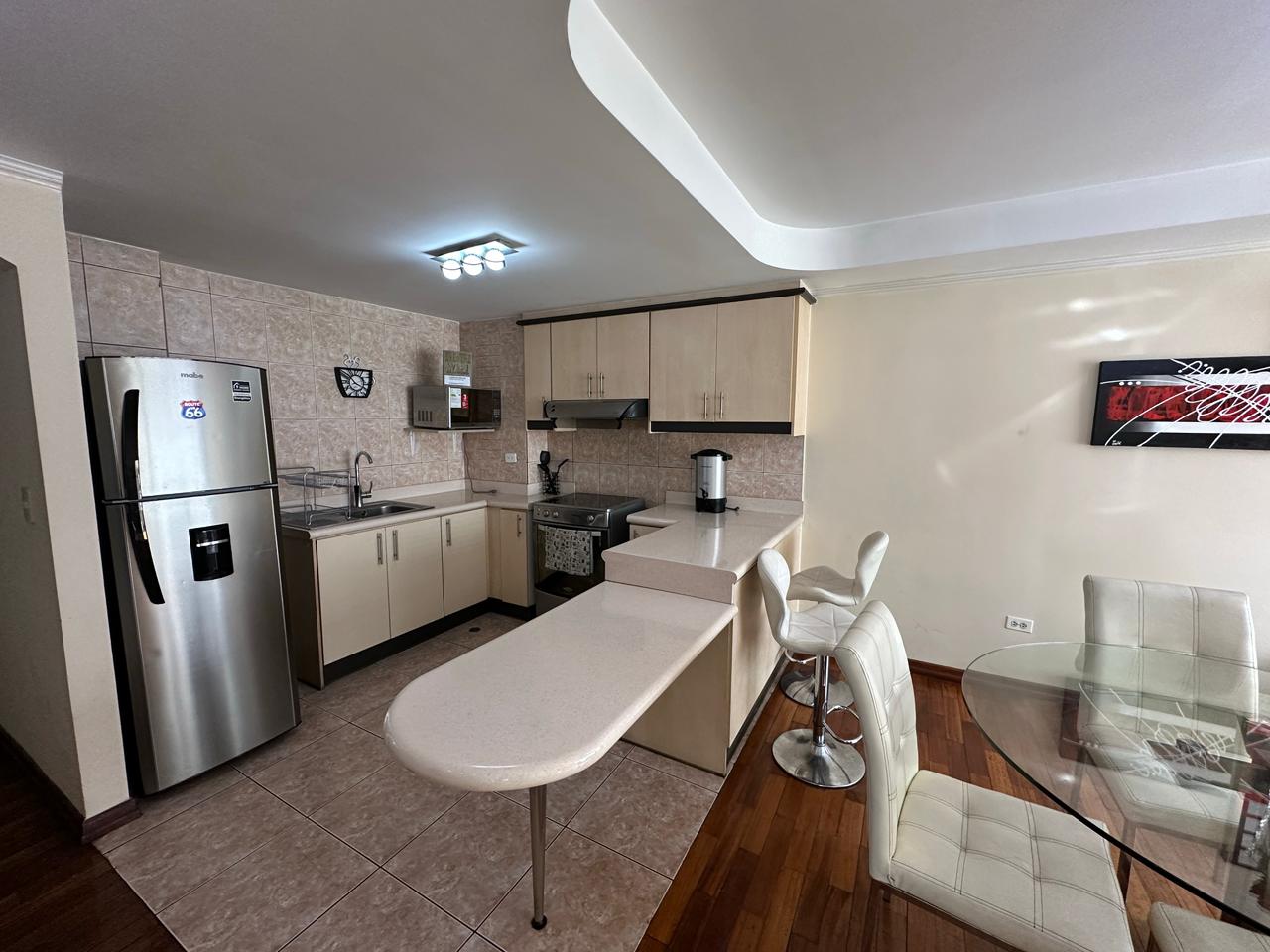 • COCINA ESTILO AMERICANO, CON COCINA DE INDUCCIÓN, HORNO, EXTRACTOR DE OLORES, REFRIGERADORA, MICROONDAS, MUEBLES DE COCINA Y DESAYUNADOR