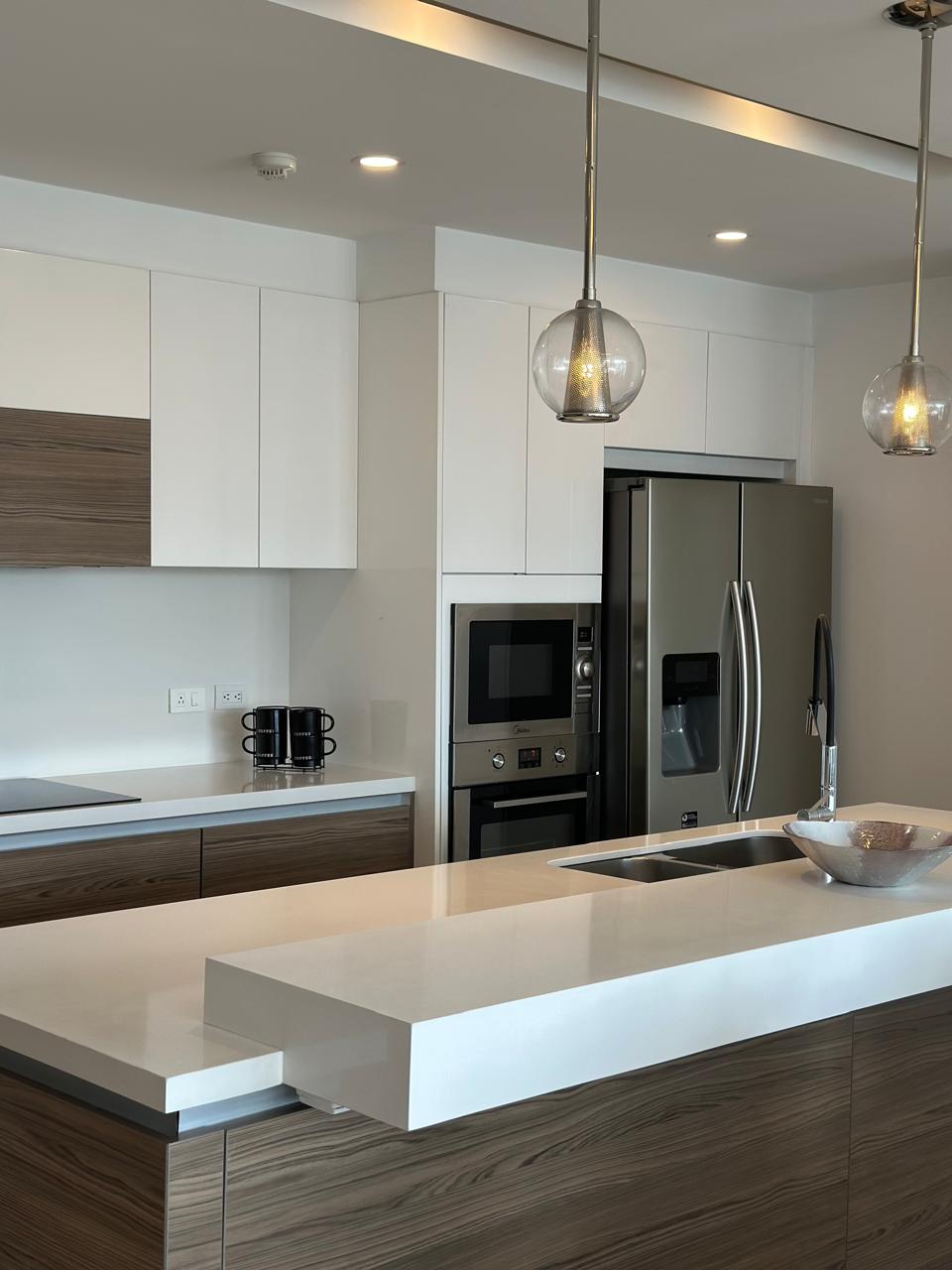 • COCINA MODERNA, ESTILO AMERICANO, CON PLANCHA DE COCINA DE INDUCCIÓN, EXTRACTOR DE OLORES, LAVAVAJILLAS, VINERA, HORNO, MICROONDAS, REFRIGERADORA, DESAYUNADOR Y MUEBLES ALTOS Y BAJOS DE COCINA